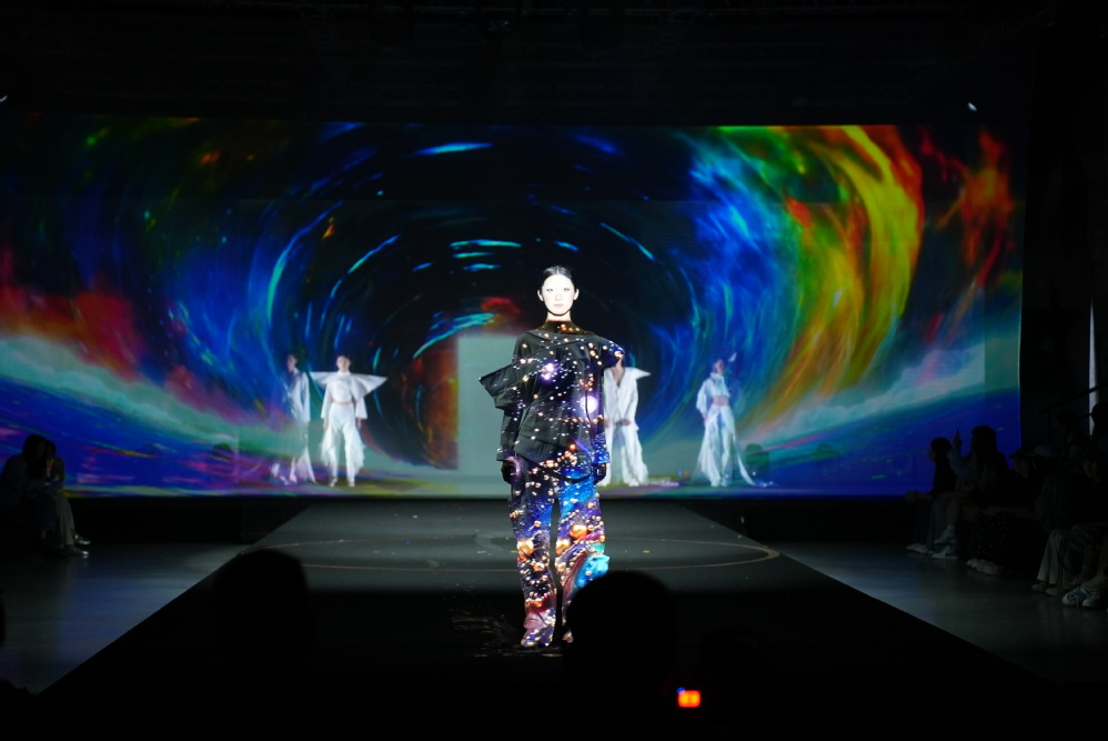 其中,动态走秀由时尚表演与传播专业学生演绎,服装设计由人物形象设计专业师生完成,整场演出以白色坯布为数字画布,融合AI图形生成与光影投影技术,动态呈现“人类文明”“自然生态”等四大主题。舞台设计与制作专业师生负责整体光影方案,打破传统模特秀形式,展现低碳时尚与未来美学的融合表达。