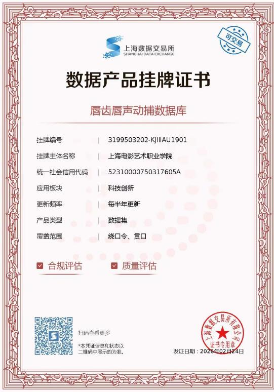 马年新春,上海电影艺术职业学院标志性成果唇齿唇声动捕数据库在上海数据交易所成功登陆并挂牌。这也是学校继舞蹈动捕数据库(全国首个高校数据产品)后又一次成功登陆上海数据交易所。