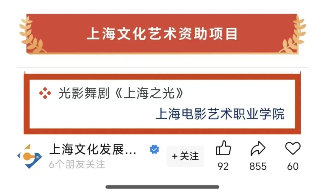 近日,经中共上海市委宣传部委托评审,上海文化发展基金会正式公布2025年度第二期资助项目名单。上海电影艺术职业学院演艺学院打造的光影舞剧《上海之光》成功入选。