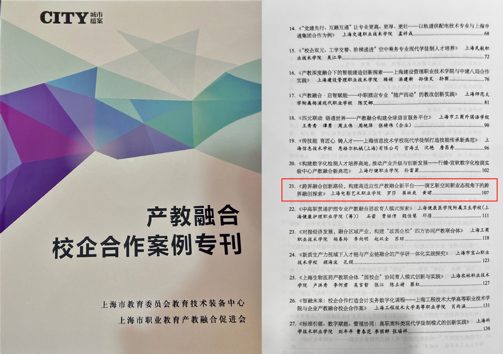 上海电影艺术职业学院因在组织推动产教融合工作中的卓越贡献,被授予“优秀组织奖”。由音乐剧表演专业教师团队罗莎主任、崔姝爽、黄珺老师执笔的案例 《跨界融合创新路径,构建高适应性产教融合新平台——演艺新空间新业态视角下的跨界融创探索》 荣获一等奖,赢得了行业的高度赞誉。该案例集中展示了学院音乐剧表演专业在应对文化产业新业态、探索产教深度融合新模式方面的前沿思考与实践成果,其完整研究成果已于2025年12月正式发表。