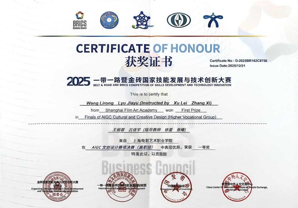 2025年12月21日,2025一带一路金砖国家技能发展与技术创新大赛“AIGC文创设计”赛道全国总决赛落幕。我校广告专业学生吕佳宇、王丽蓉历经区域赛、国赛、路演三轮严苛选拔,斩获各阶段一等奖,最终在全国总决赛路演环节卫冕高职组全国一等奖,强势入选“金砖未来技能人才库”。作为本次大赛中唯一获此殊荣的上海高职院校,充分彰显了我校广告专业在AI赋能文创设计领域的教学实力与技术优势。